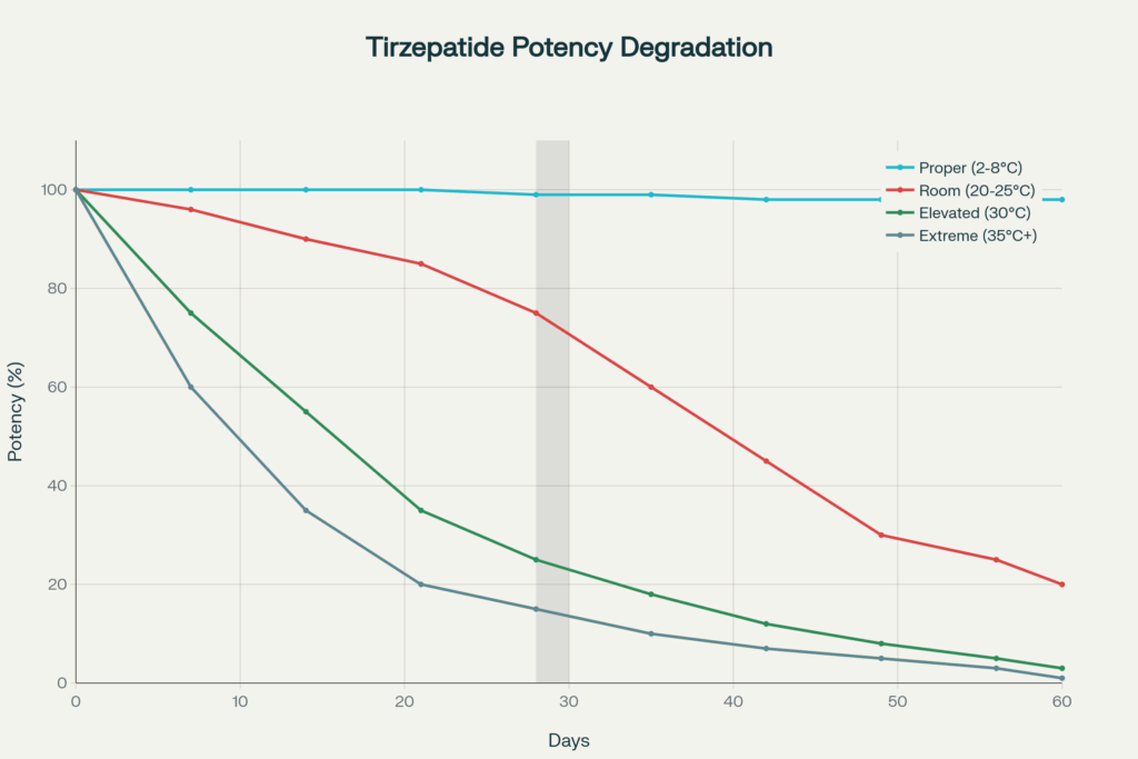 Exposure to temperatures above 30°C (86°F) causes rapid degradation. At these temperatures, tirzepatide effectively expires immediately, regardless of the printed expiration date. Heat exposure of just hours can cause significant structural damage to the peptide, reducing or eliminating its therapeutic efficacy.